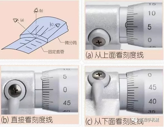 3. 讀取微分筒刻線時直視基準線。如果從某個角度看刻度線,由于視覺誤差將不會讀取線的正確位置。