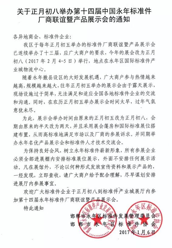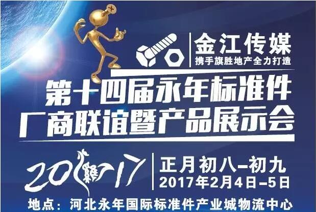 為加強(qiáng)全國(guó)標(biāo)準(zhǔn)件行業(yè)內(nèi)外交流和信息溝通,推動(dòng)永年標(biāo)準(zhǔn)件產(chǎn)業(yè)上檔升級(jí),宣傳推廣標(biāo)準(zhǔn)件產(chǎn)品和品牌,增進(jìn)標(biāo)準(zhǔn)件廠商信息交流和感情溝通,充分利用永年撤縣設(shè)區(qū)的大好發(fā)展機(jī)遇,邯鄲市金江傳媒廣告有限公司定于2017年2月4-5日(農(nóng)歷正月初八--初九)在中國(guó)永年國(guó)際標(biāo)準(zhǔn)件產(chǎn)業(yè)城物流區(qū)召開(kāi)第十四屆中國(guó)•永年標(biāo)準(zhǔn)件廠商聯(lián)誼暨產(chǎn)品展示會(huì)。